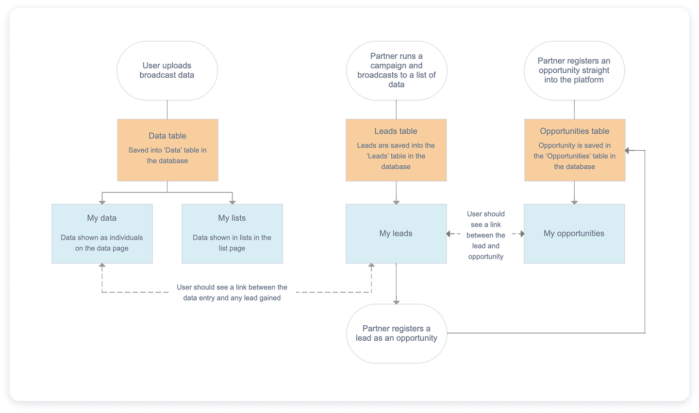 The initial phase focused on scoping the feature with stakeholders and the development team. I began by mapping out end-to-end workflows that illustrated how a lead would move from Campaign Builder into opportunity registration, including all key decision points and required data handoffs. These workflows became a shared visual reference, helping to bridge the gap between business requirements and technical feasibility.